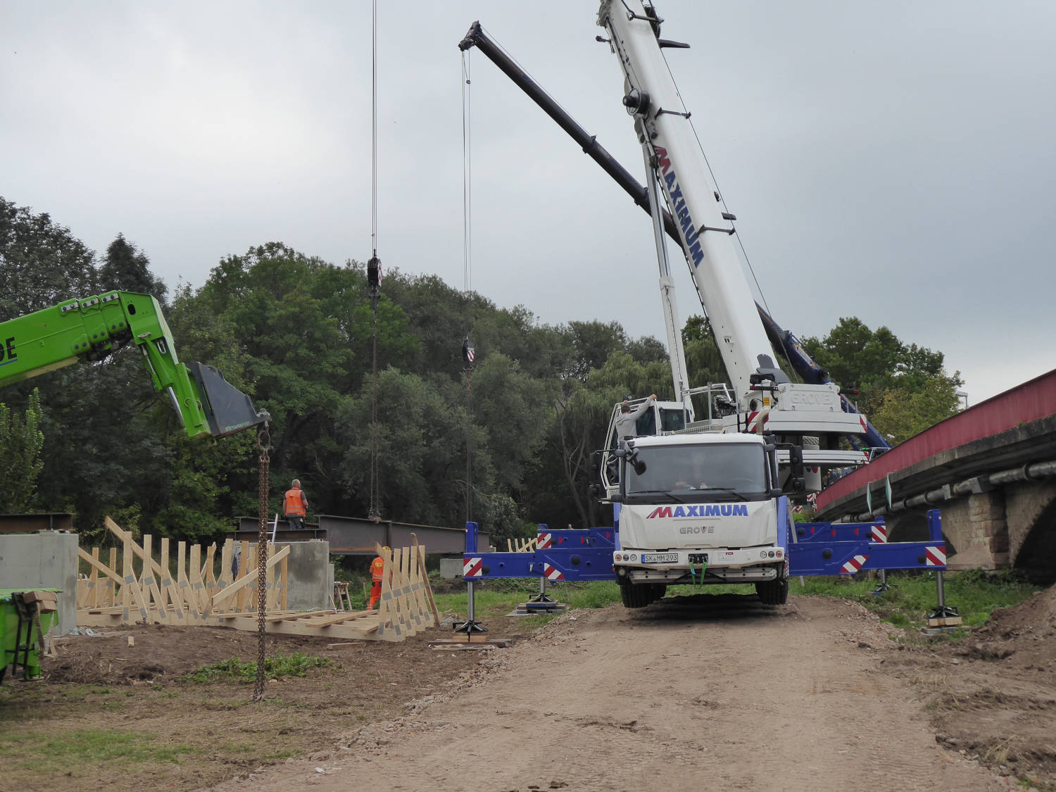 Am 28.9.2021 um 7:00 Uhr beginnt der Tandemhub mit zwei Autokranen. Auf der Tröbsdorfer Uferseite kam ein 250-Tonnen Autokran und auf der Burgscheidungener Uferseite ein 200-Tonnen Autokran zum Einsatz. Die Schwerlastransporter rangierten die Brückenelemente auf die Baubehelfsbrücke. Von dort aus wurden diese mit den zwei Kranen angehoben.