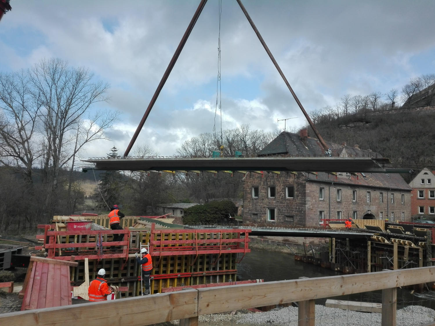 Im Tandemhub wurden die Fertigteile der Unstrutbrücke eingehoben, das Bild überließ uns freundlicherweise der Projektleiter Herr Raudzus der Firma Glass.