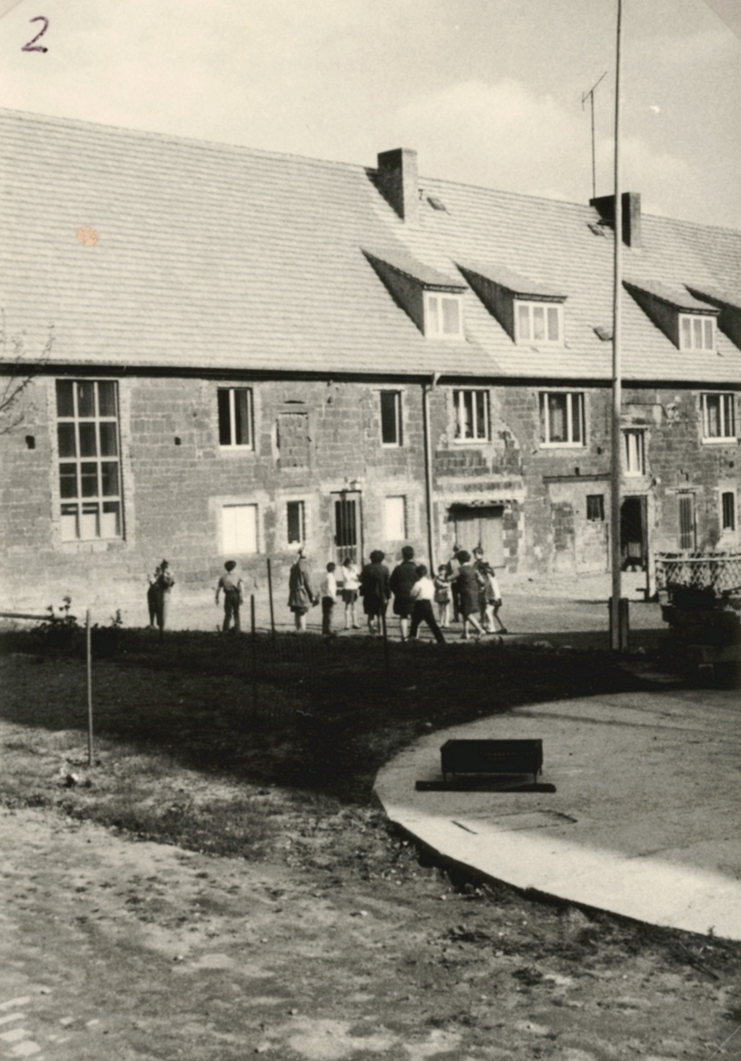Dieses Bild entstand um 1970, damals feierten die Lehrerkinder den Kindertag. Das Bild zeigt den ehemaligen Pferdestall des Gutshofes. In den 1960er Jahren entstanden dort Wohnungen, Klassenräume und im linken Gebäudeteil (große Fenster) eine Turnhalle.